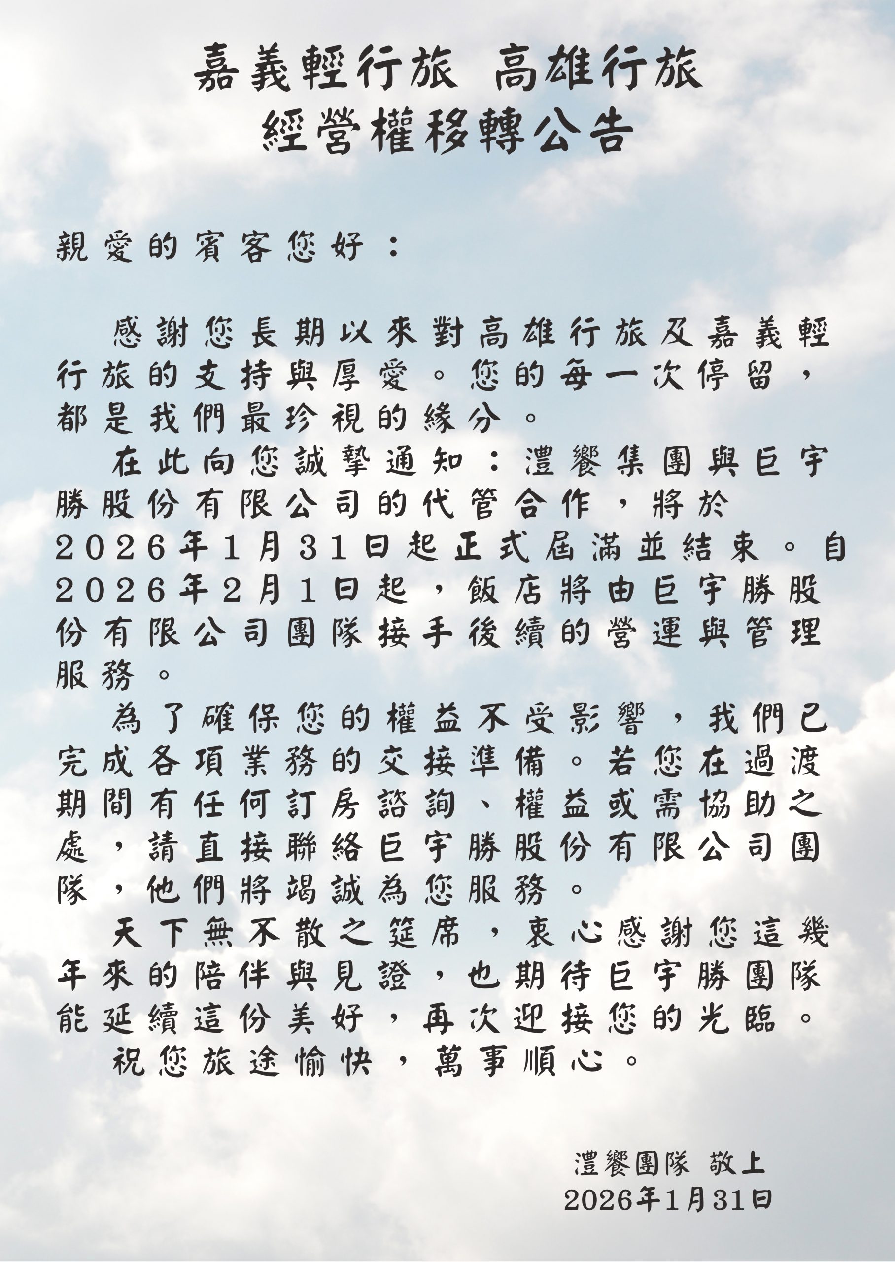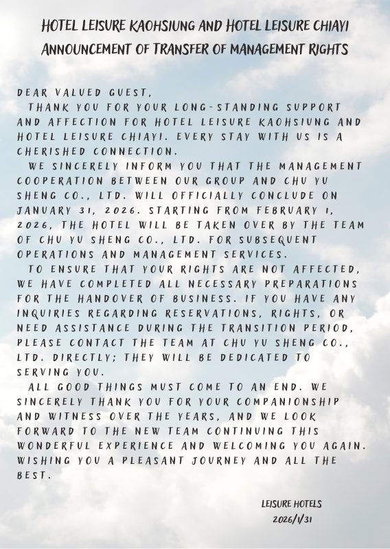 嘉義輕行旅、高雄行旅經營權移轉公告